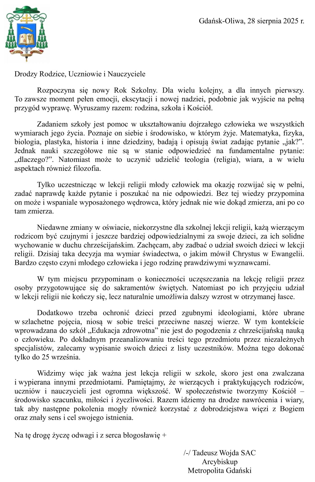 W trosce o kształt nauczania w szkołach i przyszłość młodego pokolenia, ks. abp Tadeusz Wojda wystosował list do wiernych: